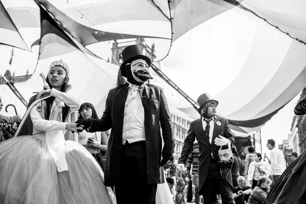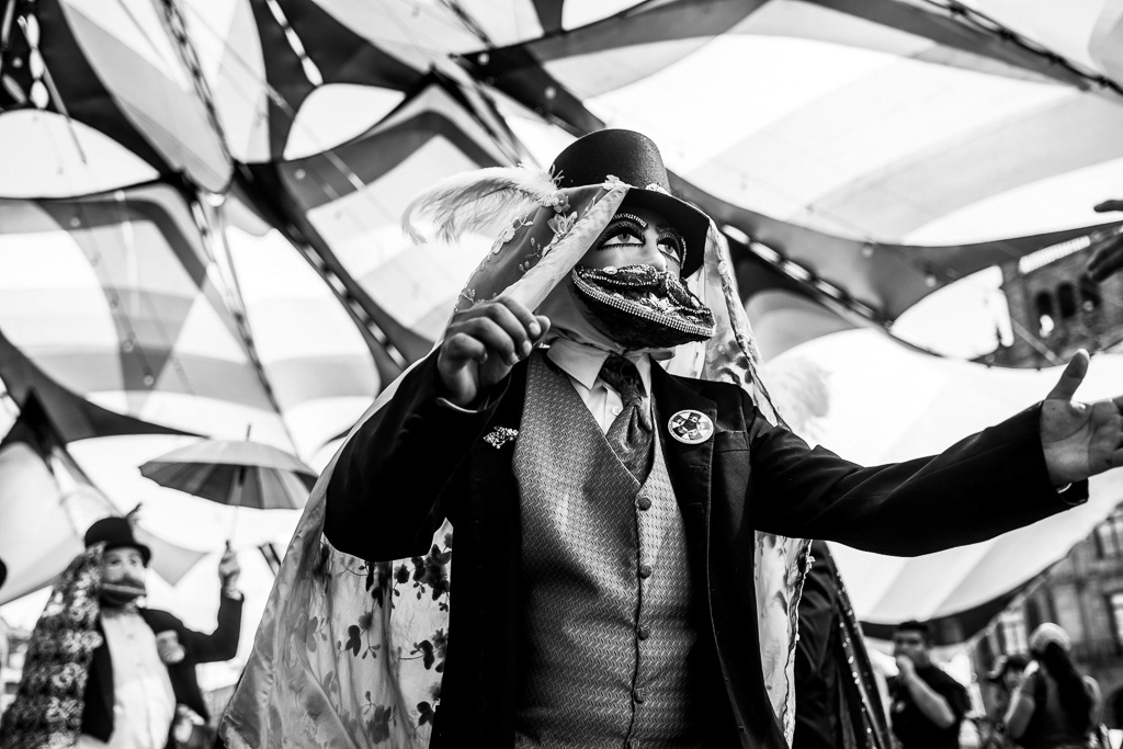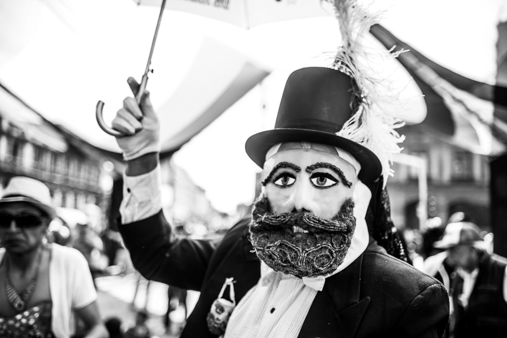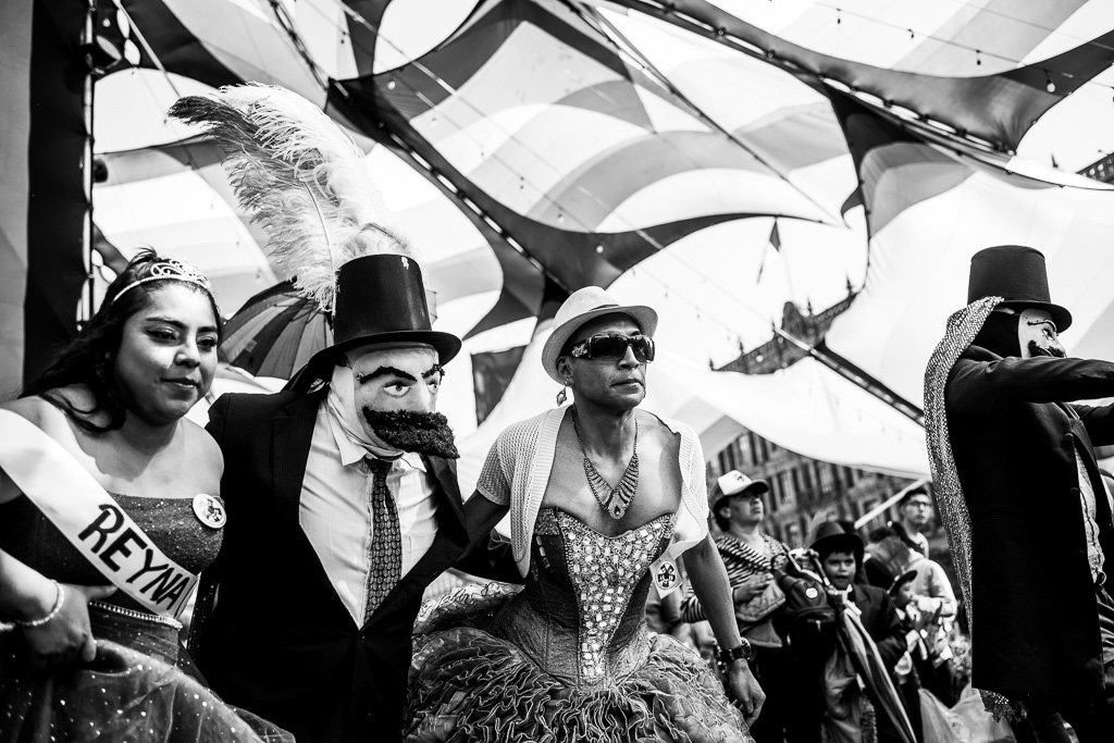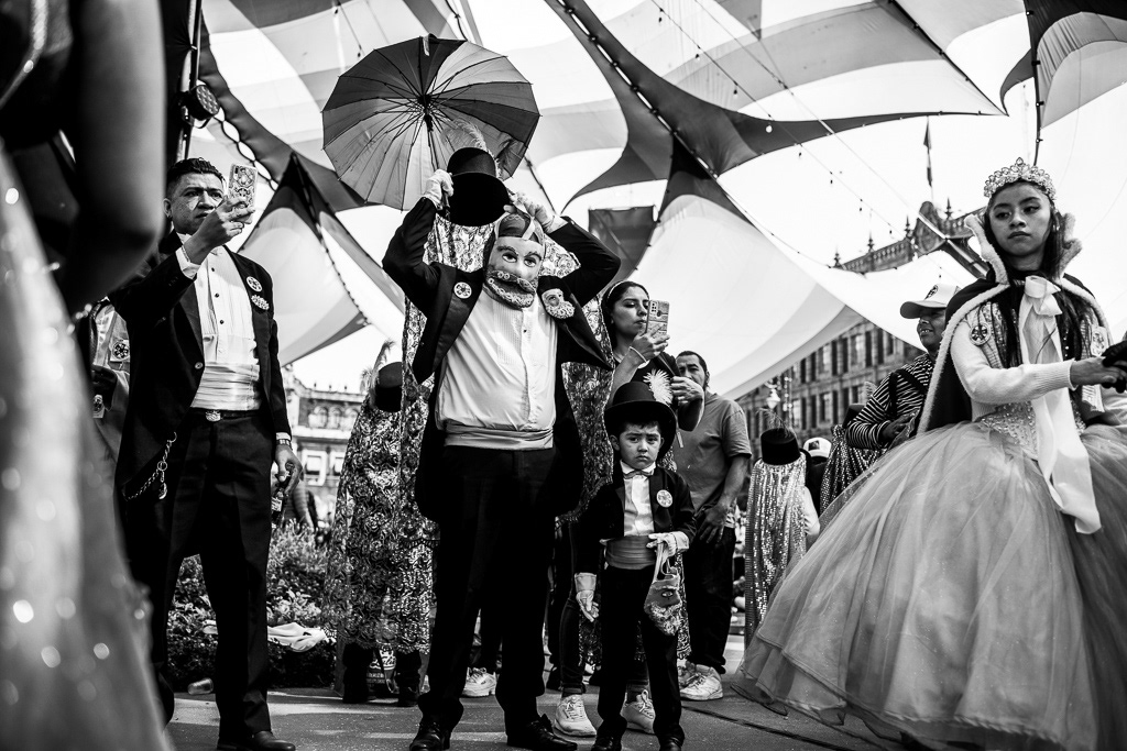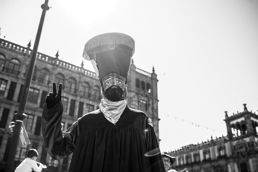 This series of photographs narrates the first parade of Chinelos and Huehuenches in the Plaza de la Constitución, Mexico City. The prohibition of this dance originated in the 16th century as a mockery, critique, and satire of European carnivals and the colonizing people. After the ban, the dancers migrated to the outskirts of the city, to their native towns. The 'guegenchis' or dance of the masks was presented as an act of resistance against labor exploitation and land dispossession. The word 'huehuenche' comes from Nahuatl and means 'old man', while 'chinelo' derives from 'tzineloua', referring to the hip movement that characterizes their dance. The typical costumes from Tlayacapan, Yautepec, and Tepoztlán paraded down Avenida 20 de Noviembre with their peculiar wax masks, colored eyes, rosy cheeks, and pointed beards, imitating the face of Maximilian of Habsburg. A historical debt was symbolically repaid by allowing the native peoples to once again dance and express themselves through dance and masks in the Zócalo of Mexico City.
